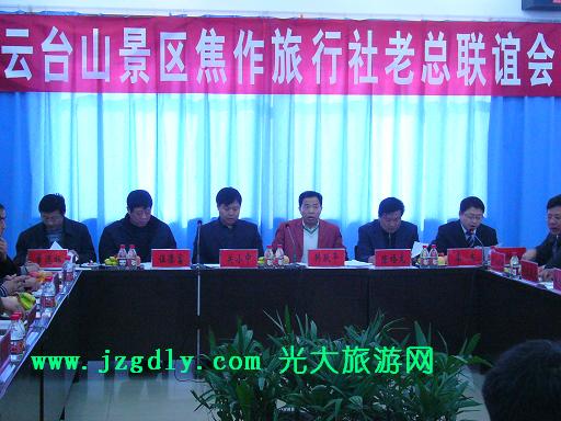云台山举行2008年焦作旅行社老总联谊会,焦作一共有79家旅行社参加,云台山对2007年的旅游市场进行了分析,公布了4月份云台山门票中所含的景区交通费要涨价30元,届时门票全额应是180元/人(含景交),云台山局长、董事长韩跃平亲自出席并作了重要讲话,山东市场2007年是云台山的主要客源地,占全部游客的50%还要多,中午韩跃平局长陪同旅行社老总共进午餐。